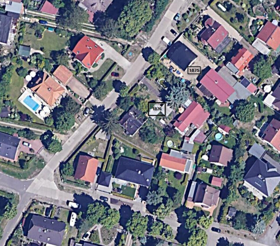 Vergebliche Mühe, denn so erkennt man keinerlei Zusammenhang über den der beiden Grundstücksteile untereinander hinaus; d.h. man hat keine Chance, evtl. zu einem besseren Vorschlag zu finden.Es gibt keinen beeinflussbaren Zusammenhang über die beiden Grundstück und die Straße hinaus. Ringsherum sind nur andere Grundstücke mit Einfamilienhaus oder Bundgalow oder Stadtvillenbebauung.Aber ich habe gerne die entsprechende Flurkarte aus dem ALKIS rausgesnippt.