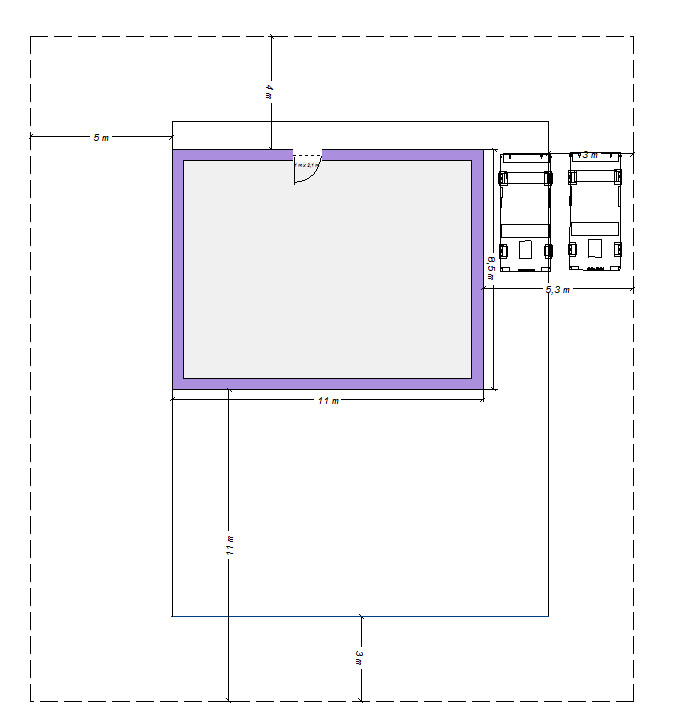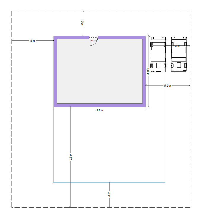 Bin ganz bei @ltenzer, würde aber beide Stellflächen zusammen hinters Haus legen und das Haus als Rechteck planen: