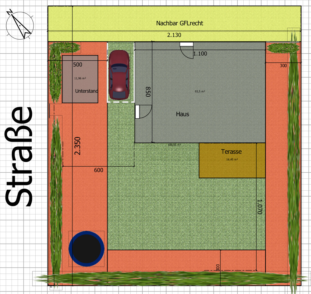So hatte ich schon überlegt, dann als Grenzbebauung mittelfristig einen kleinen Unterstand für Mülltonnen, Fahrräder etc. direkt an die Grenze zur Str. und dem GFL-Streifen zu packen und dann den einen Stellplatz daneben.