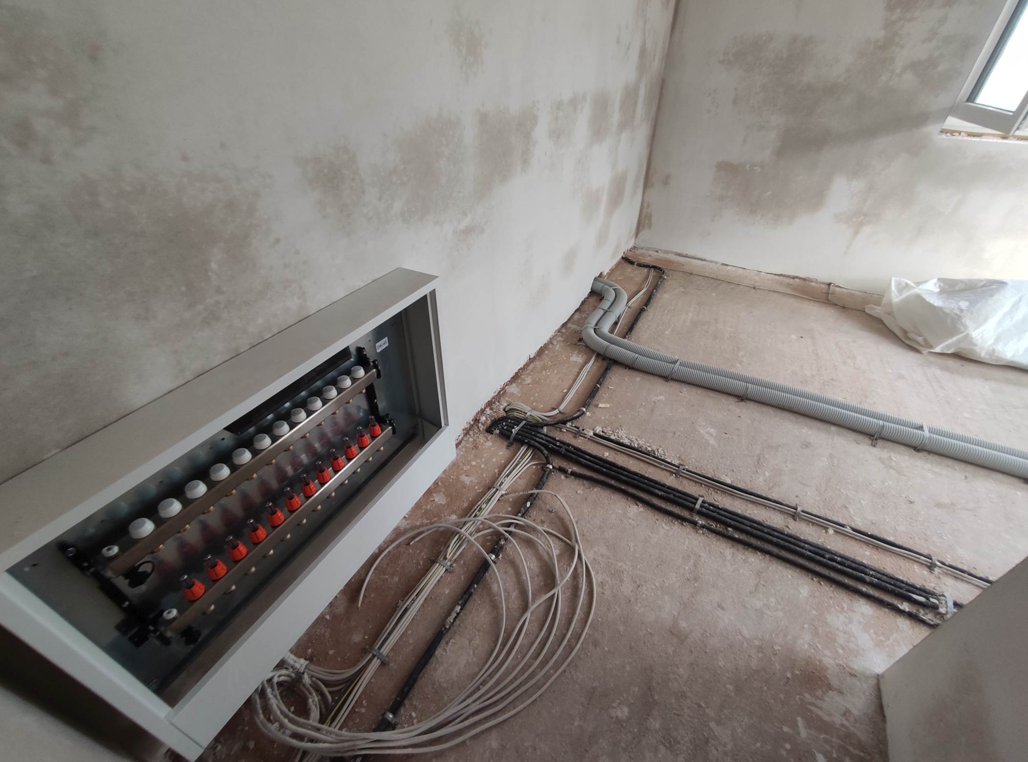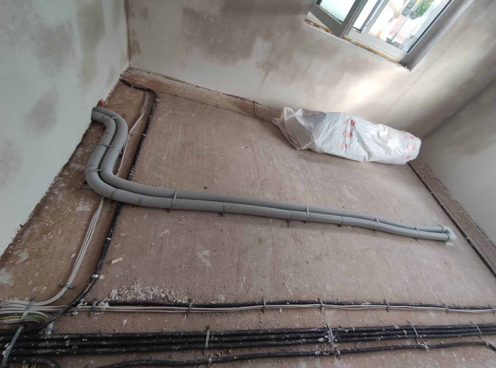 Dadurch, dass ich zwei Schichten PIR und noch eine Schicht EPS hatte, hatte ich meinen Aufwand kurzerhand um 50% erhöht. Dadurch, dass die Elis teilweise Leitungen kreuzen ließen (auch dort wo gar nicht nötig, hätte man sich vorher mal einen Plan gemacht) reichte das 20mm EPS nicht überall zum Ausgleich und ich musste auch das PIR schnippeln.
