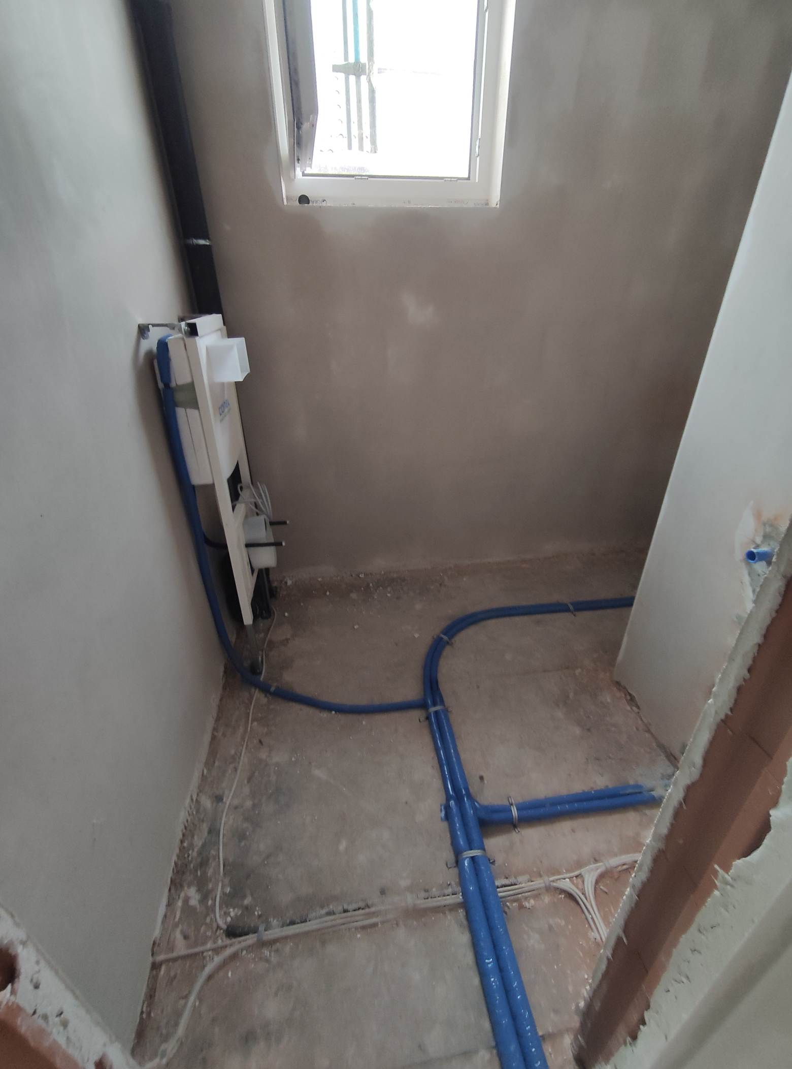 Gästebad EG. Illustriert sehr schön warum es eine doofe Idee ist den Sanit erst nach dem Innenputzer reinzulassen...