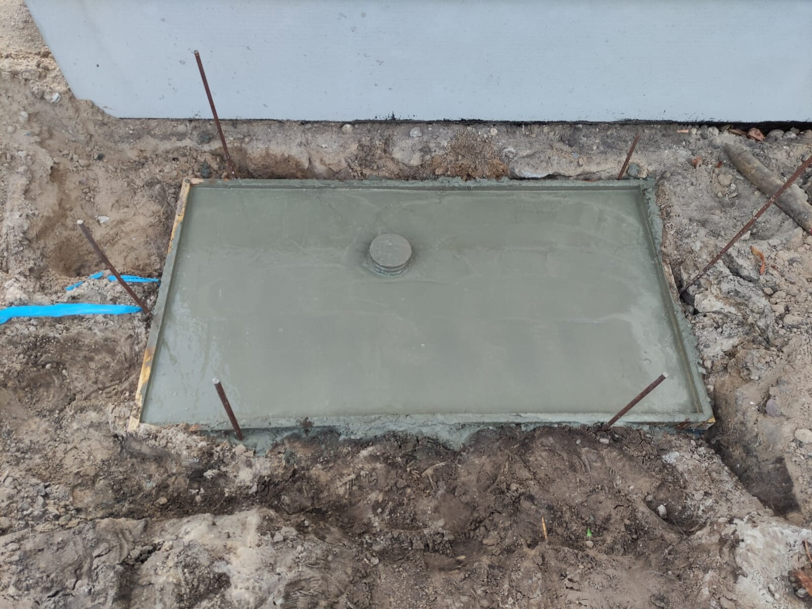 Frisch gegossene Betonplatte in Grube mit zentralem Rohrdeckel und Bewehrung.