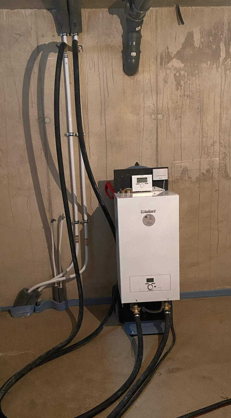 Derweil wird der Wasseranschluss fertig gemacht, Entkalkungsanlage eingebaut und soweit alles vorbereitet, dass Die Wärmepumpe nur noch aufgestellt, angeschlossen und angeschalten werden muss.