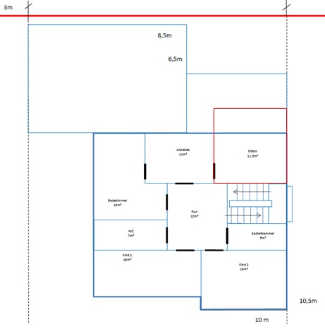 wäre es evtl. denkbar bzw. eine weitere Möglichkeit auch im OG Teilweise den Technickraum aus dem EG zu bebauen? Ähnlich einer Abstufung wie beim Wohnzimmer im EG? Um so noch ein paar Meter zu bekommen? (rot markiert) + Entfall der Türe zum Badezimmer um die Ankleide besser nutzen zu können.