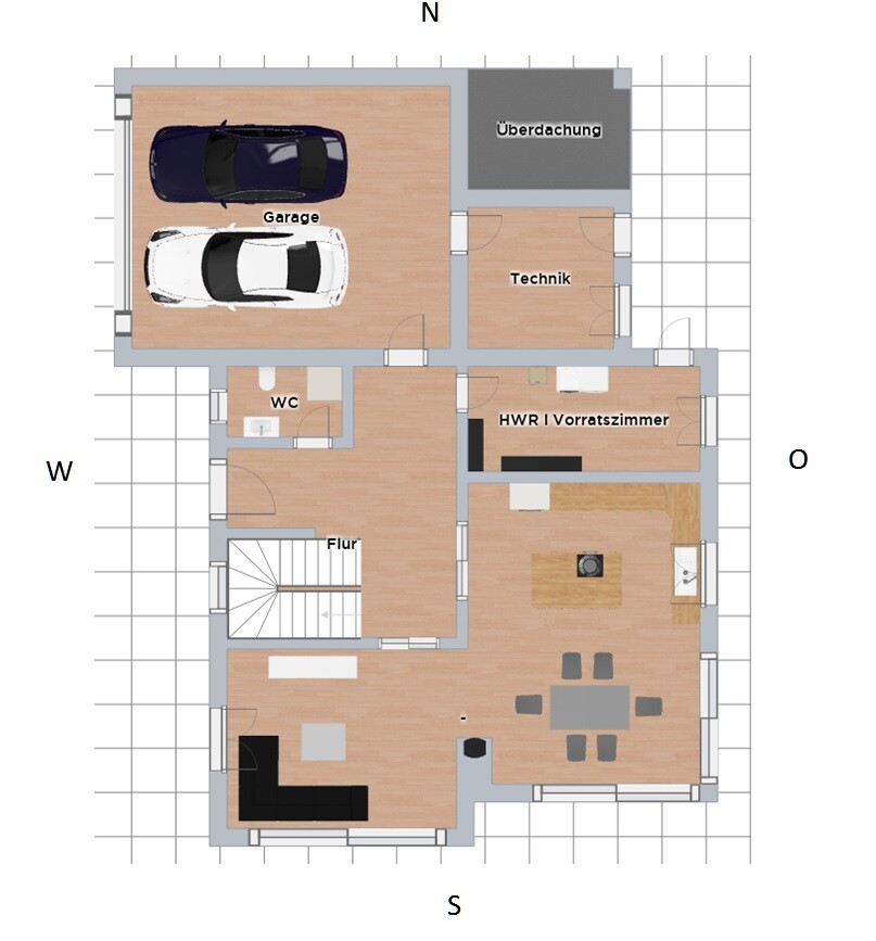 Grundriss: Garage mit Autos, Wohn- und Essbereich, Küche, HWR/Vorratsraum, Technik, WC, Flur, Treppe