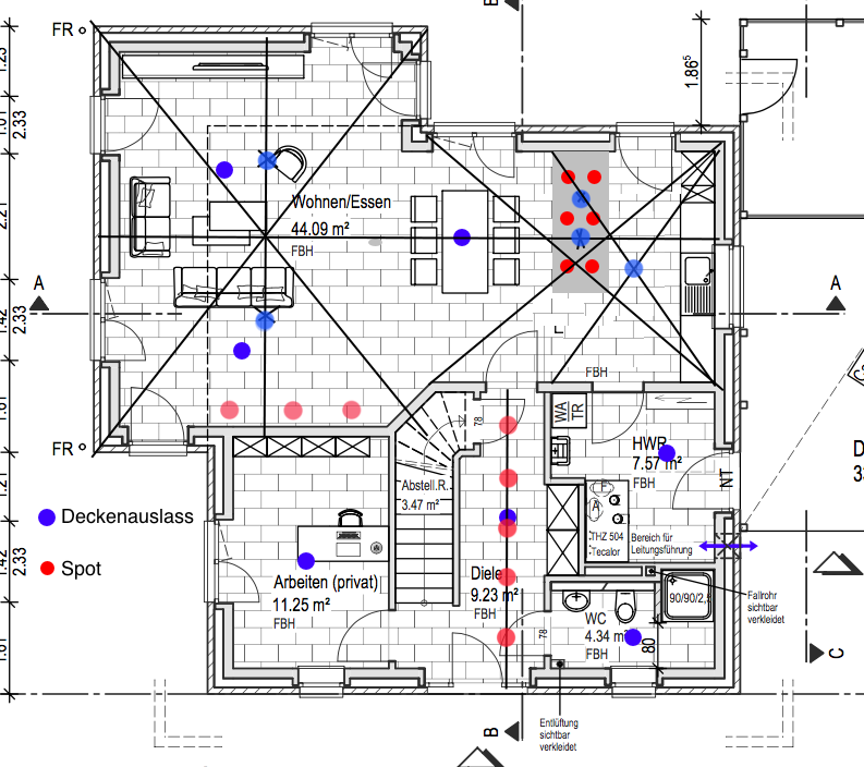 Vielen Dank für die Tipps. An die Wand der Treppe soll eine Wandlampe, dazu gibt es 4-5 Wandspots als Treppenbeleuchtung. Im Abstellraum kommt eine Lampe ran. Beides haben wir in diesem Plan nicht mit drin da es keine Auswirkung auf die Betondecke hat und später entschieden werden kann.