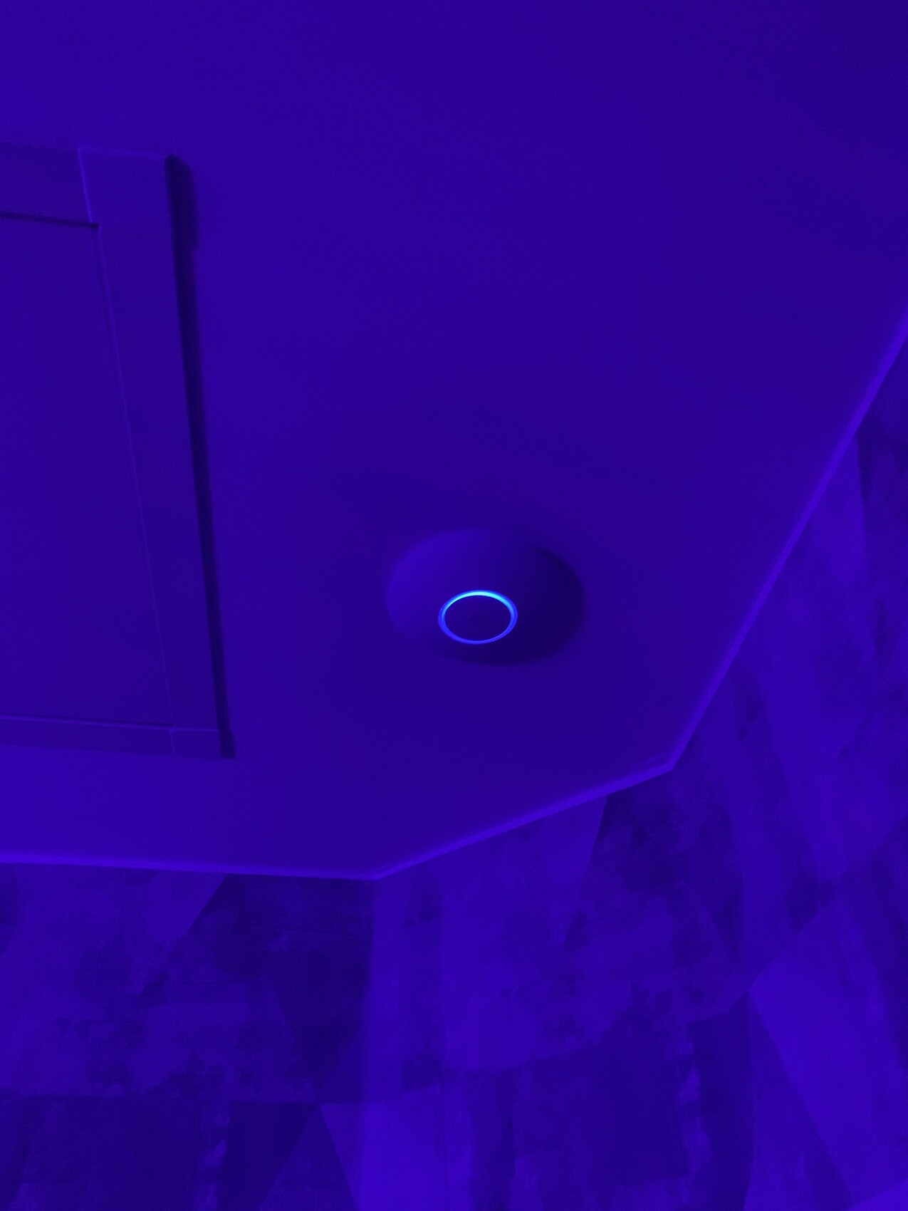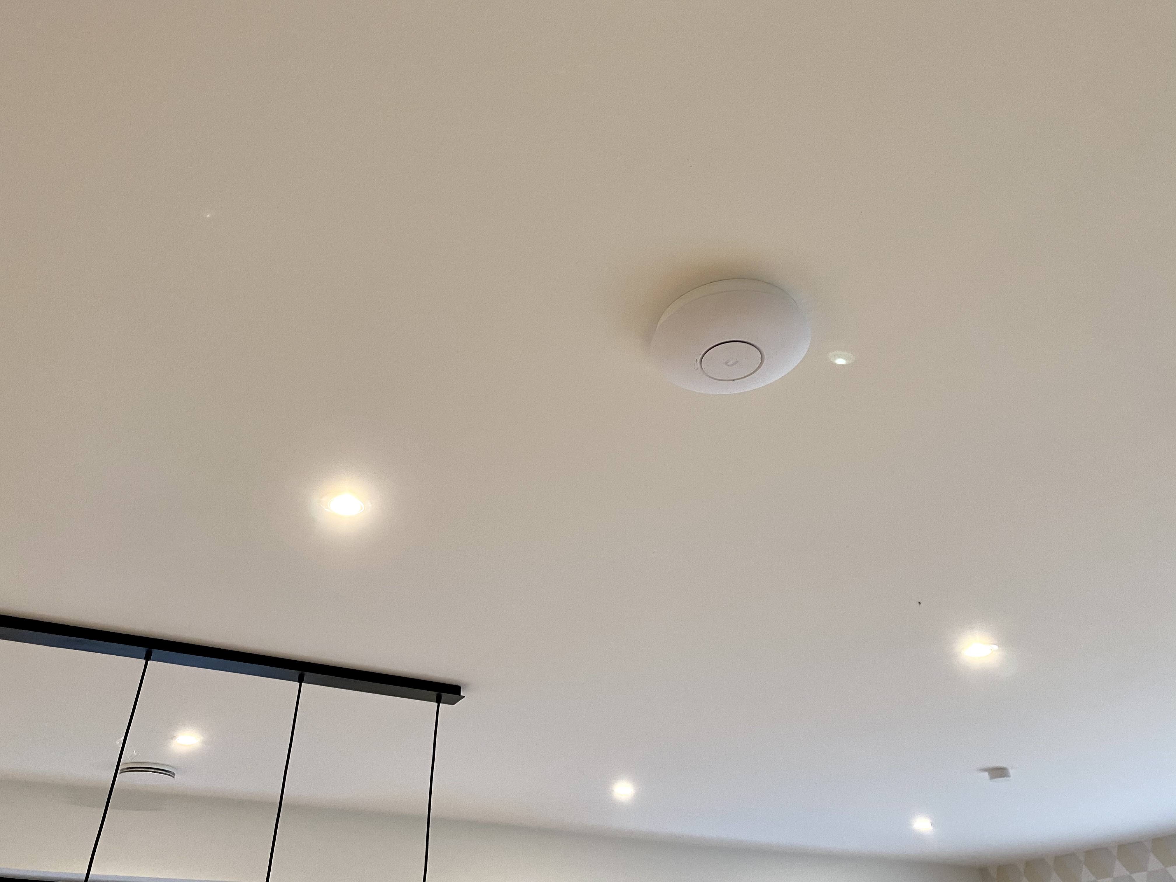 Es war aber gar nicht so einfach, diese Abstandsringe zu finden. Oder ich habe mich ungeschickt angestellt. Letztendlich habe ich 18cm-Holzplatten mit 6mm Dicke bestellt, jeweils 3 miteinander verleimt, abgeschliffen, weiß gestrichen und in der Mitte mit einem Lochbohrer "ausgehöhlt". Und dann gemeinsam mit der Adapterscheibe von Unifi an die Decke.