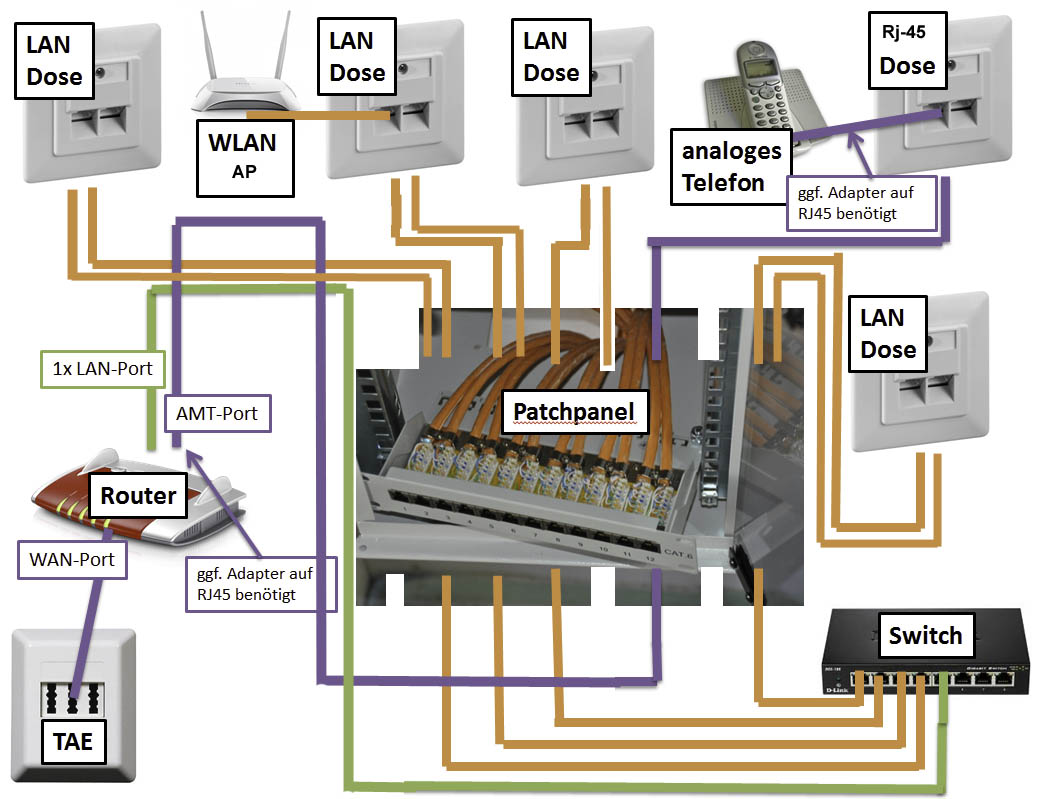 Etwas "moderner" wäre allerdings die Verwendung von IP-Telefonen. Die kommen in einen normalen (im Bild orange) LAN-Anschluss oder sogar über WLAN. Entweder am Switch oder direkt am Router, das spielt dann keine Rolle. Strenggenommen kann man sie überall auf der ganzen Welt an einen Anschluss hängen...
