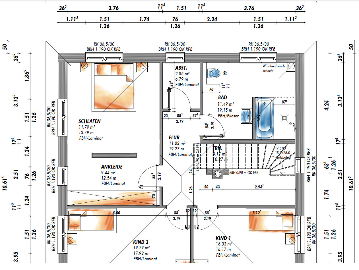 - Wäscheabwurfschacht muss oben rechts in die Ecke