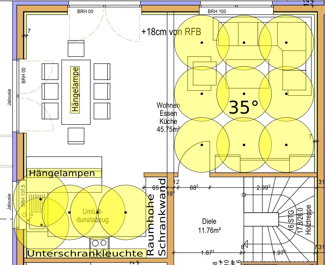 Bisher sind 9 Einbaulampen mit einem 35° Abstrahlwinkel im Wohnbereich angedacht, siehe dazu die schwarzen Punkte und der gelbe Lichtkegel.