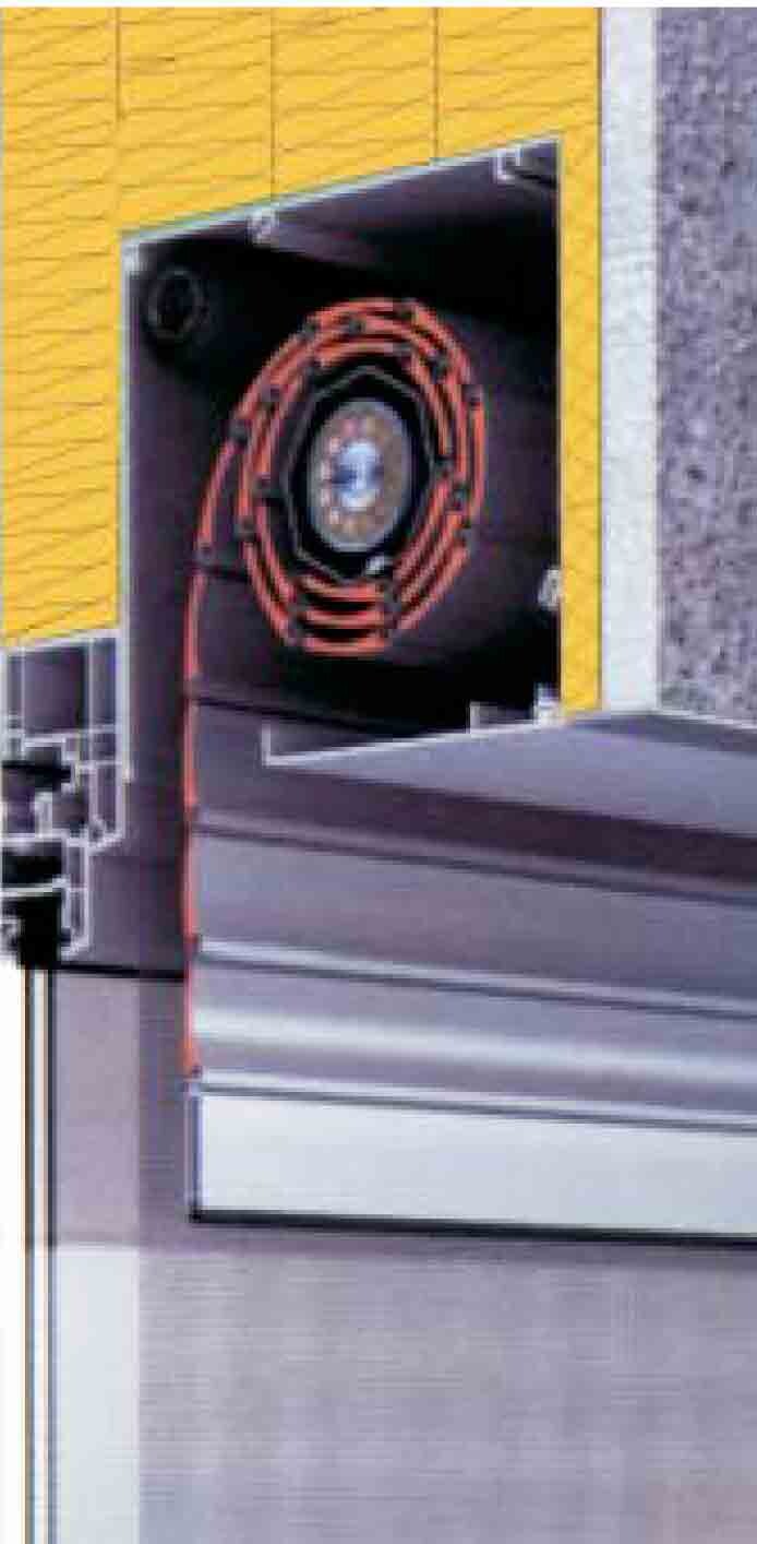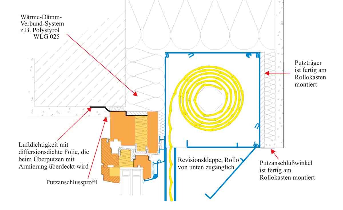 Querschnitt WDVS mit Dämmplatten, Putzträger, Revisionsklappe und Rollokastenmontage.