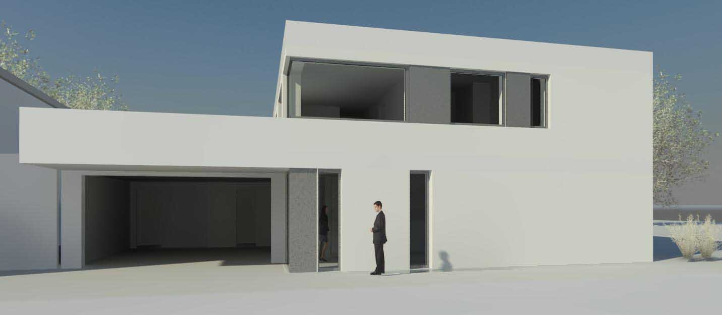 Moderne weiße Villa mit großem offenen Carport; Person in Anzug vor Eingang.