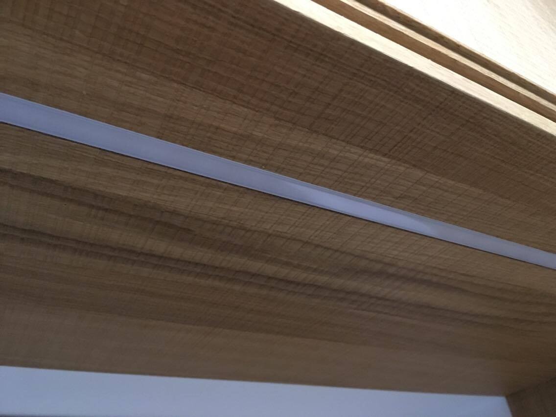 Ich habe eine LED Profilleiste in die Deckseite flächenbündig eingefräst. Dazu in extra heller 24V LED Stripe, ein versteckter Dimmer und ein Netzteil. Unauffällig und bestimmt auch die günstigste Lösung.