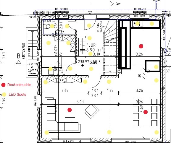 vielen Dank erstmals für das Feedback. Ich habe den Lichtplan nochmals abgeändert. Für den Gäste-WC Bereich habe ich zwei Spots eingeplant und bin von der Kalkulation ausgegangen, dass je qm ein Spot installiert werden muss. Links von dem Gäste-WC ist mein Arbeitszimmer, wo ich 4 Spots vorgesehen habe. Ich habe in den Plan unsere Küche mit eingezeichnet, der kleine Block rechts wir ein Küchentresen werden. Auf dem Linken Küchenblock sind Oberschränke montiert, daher sind hier keine Spots vorgesehen. Im Wohnzimmer habe ich mal ein paar Spots weggelassen. Ich bin aber für jeden Tipp dankbar was man hier besser machen kann