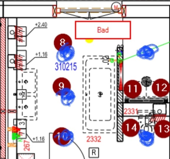 Bad: Toi 1 Spot, Dusche 1 Spot, Mitte Bad 1 Licht und ansonsten Spiegelbeleuchtung.Wo würdest Du denn den Spot platzieren? Im WC und der Dusche? Direkt über dem Kopf empfinde ich als unangenehm. Wir haben noch eine halbhohe Brüstung in der Dusche mit Glaswand darüber.