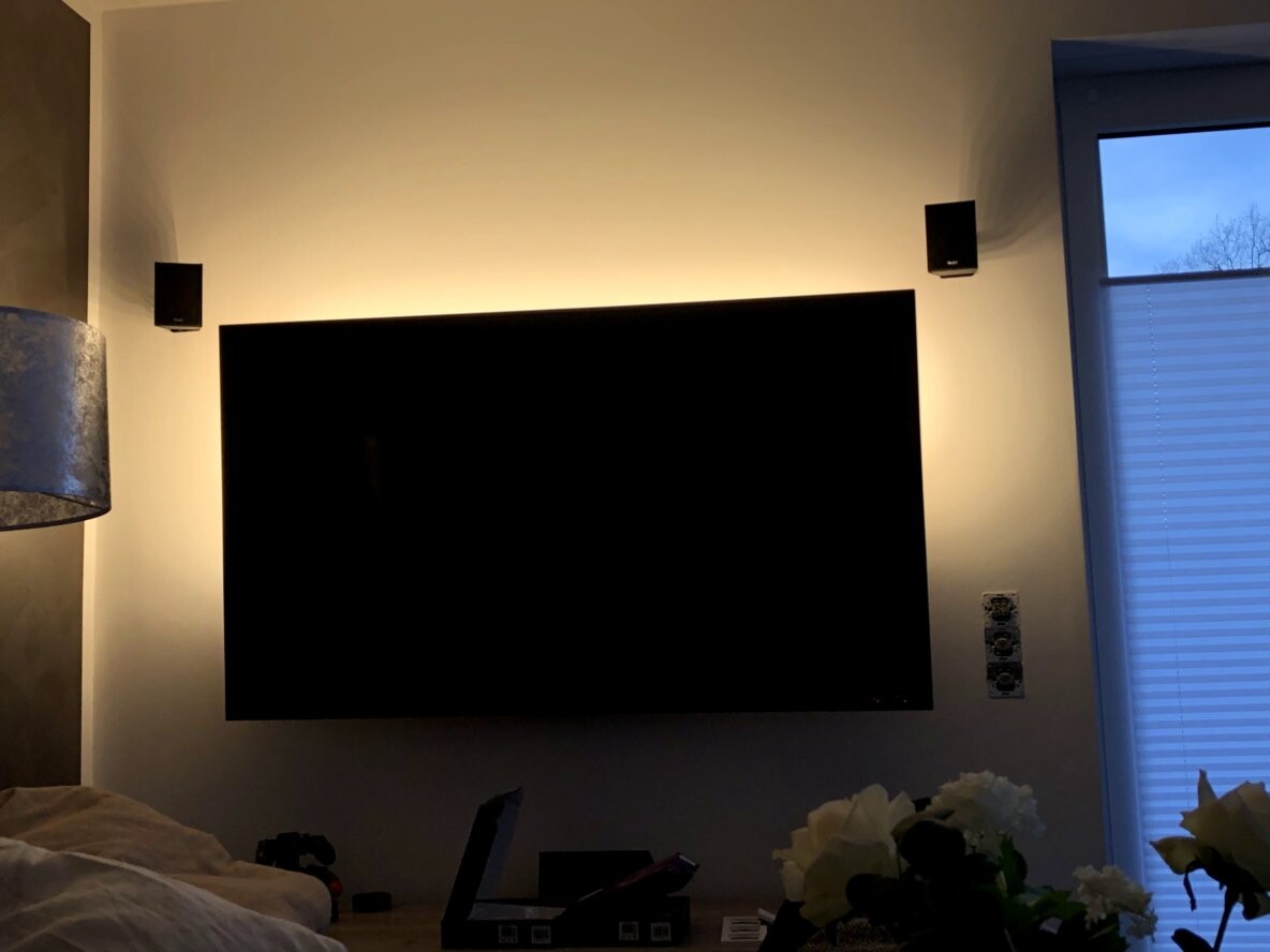 LED-Band auf den Fernseher kleben. Das ist eine schöne indirekte Beleuchtung.