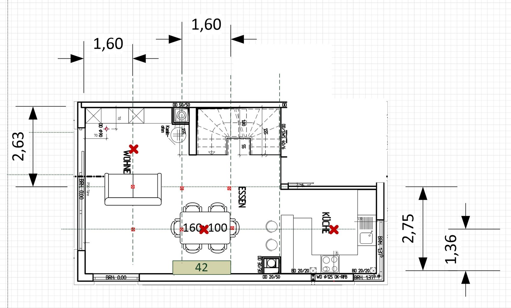 Zur Grundbeleuchtung im Wohnzimmer/Esszimmer dachte ich mir ca 6 Betondosen 10x10cm mit LED Strahlern mit weitem Abstrahlwinkel. Abstand 1,6m und 1,36m zur Wand und zueinander, siehe Bild. Am Esstisch und evtl. im Wohnzimmer kommen 2 Hängelampen hinzu. Später möchte ich eine schmale Lichtvoute oben und Links entlang der Schiebetüre mit Spots und LED Bändern installieren. In der Küche ebenfalls.