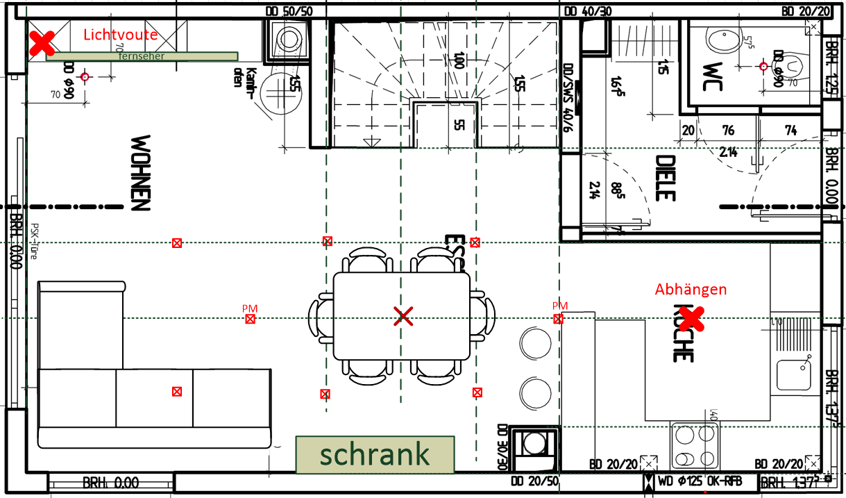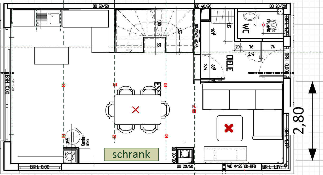 Dann sollte der Tisch aber weiter nach planklinks Richtung Terrasse und der Kamin nach planrechts neben den anderen Schacht. Dann steht der Kamin auch mitten in der Fläche und wärmt nach rechts und links.