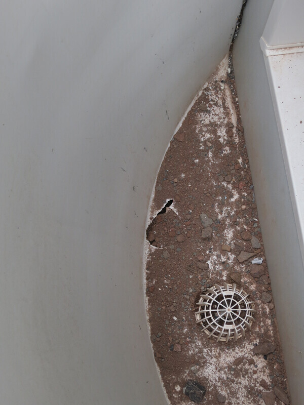 Badewannenbereich mit Erdreich, Steinen und Abbruchresten im Bad, Abflussgitter sichtbar.