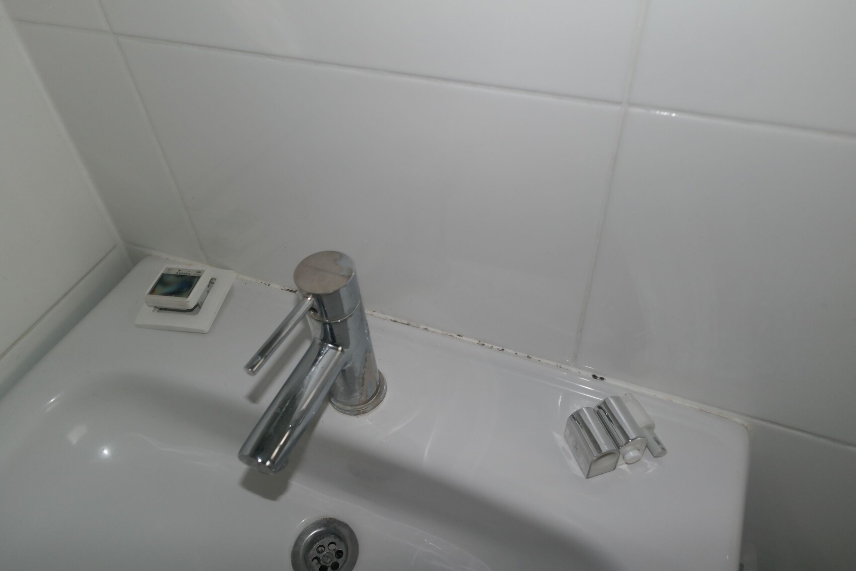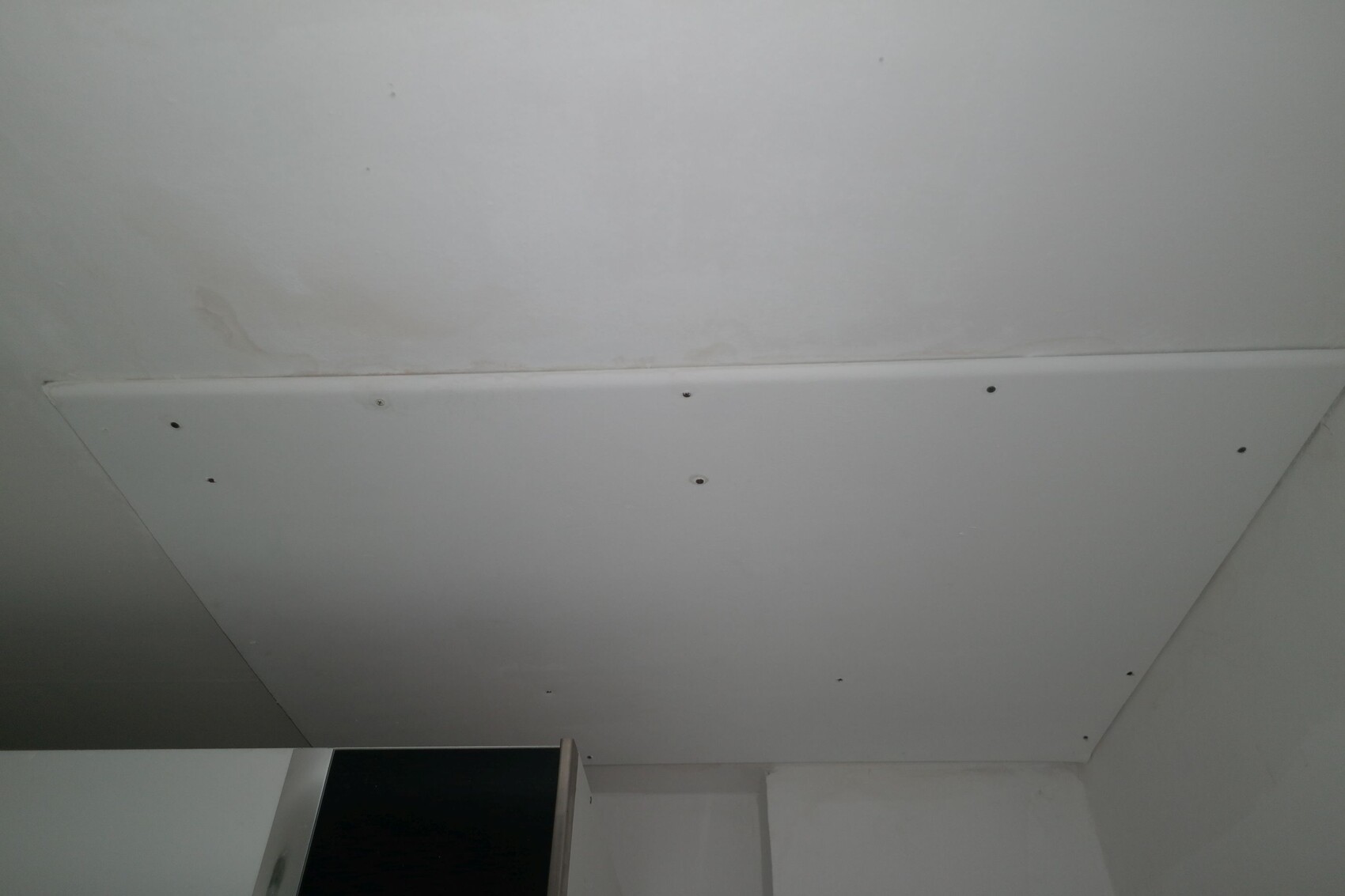 Es gab in einem Zimmer wohl mal einen Wasserschaden wo die Zwischendecke nur notdürftig repariert wurde (Gipskarton von unten) und die Fußbodenleiste angegriffen ist. Die Stellen waern aber alle trocken.