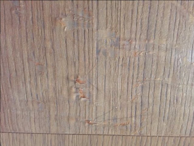 Kleinaberfein18.01.16 13:03Wie gesagt, wir haben 2 Probleme. Wie zu sehen, schlägt der Boden beim Wischen tlw Blasen, die sich auch ablösen können ( 2 ). Und er ist extremst empfindlich gegen Flecken... Ohne dass bewußt dort etwas verschüttet worden wäre. Gepflegt wurde er von Anfang an mit der empfohlenen Dr. Schutz Holzseife.