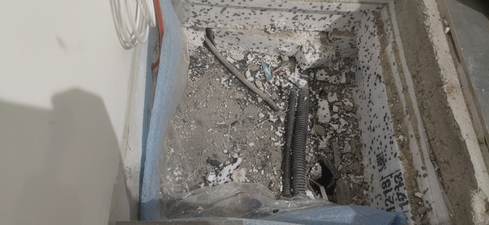 Bei uns ist im Eingang noch ein viereckiges Loch im Estrich, das wir gerne schließen würden (siehe Bild). Dort sollte das Glasfaserkabel durch das Rohr rechts unten eingeführt werden. Die Firma, die das Glasfaser verlegt hat, hat jedoch nicht mehr das Anfangsstück des Rohres vor dem Haus gefunden, sodass sie ein separates Loch (links, wo das orangene Kabel verlegt ist) gebohrt hat.
