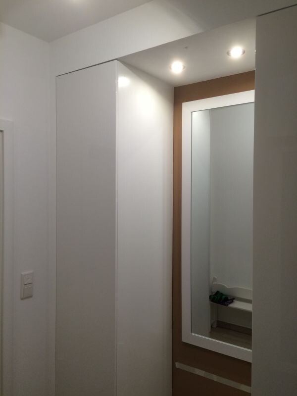 Außenrum ist alles mit Trockenbau zu und der gleiche Edelputz wie im Rest des Flurs aufgetragen worden. Die Schranktüren sind so flächenbündig. Die beiden Spots gehen über nen kleinen Bewegungsmelder, der auch da oben sitzt (sieht man wenn man genau schaut) gesteuert..