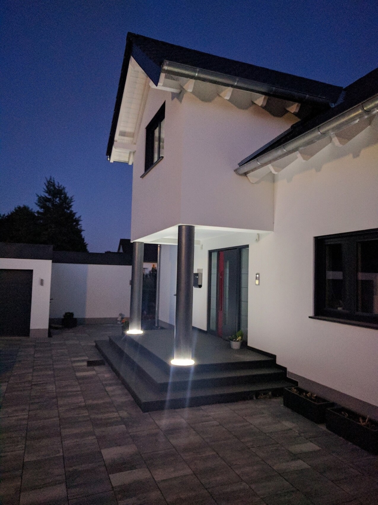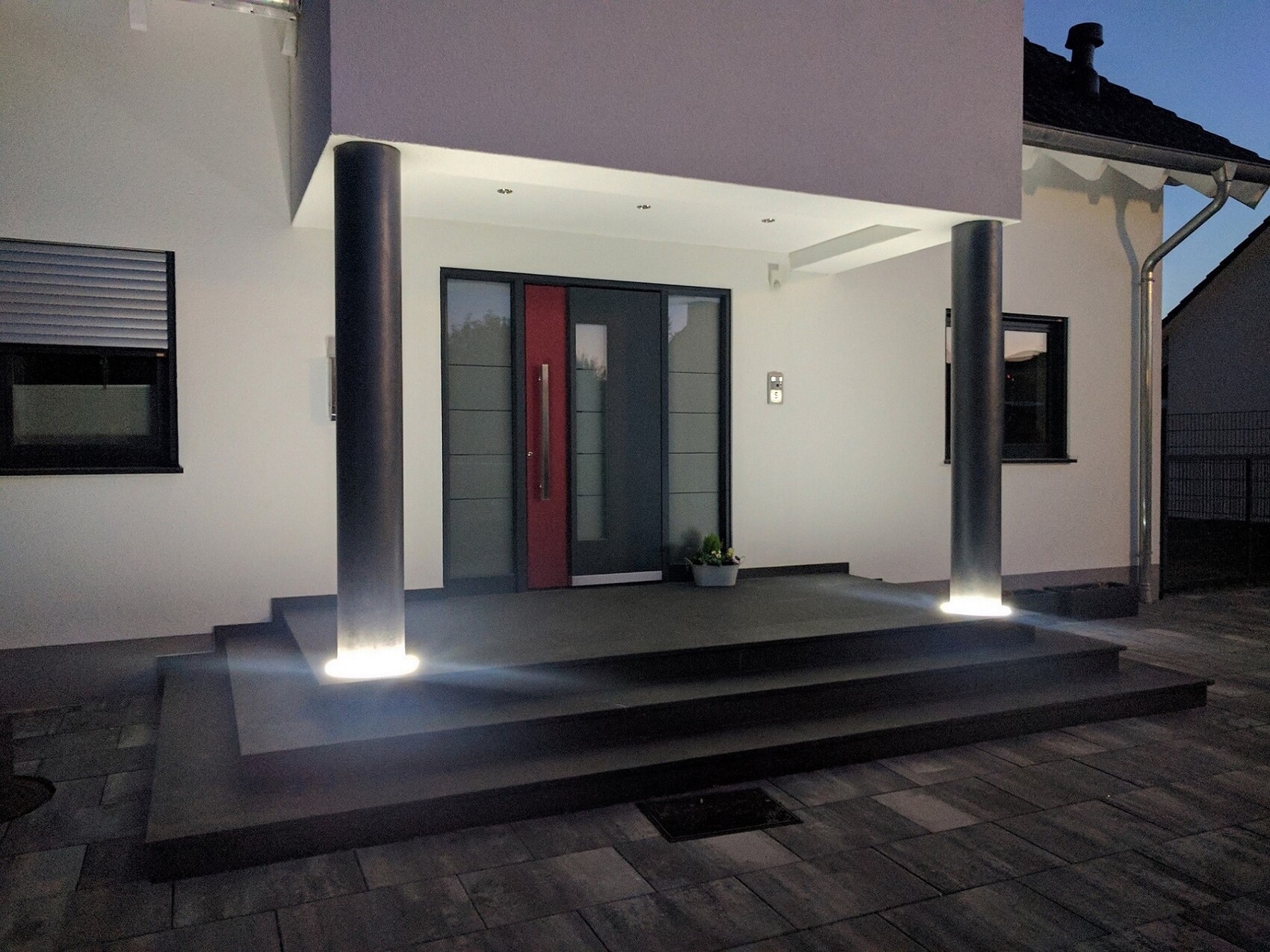 Moderne Frontansicht eines Hauses mit Eingangsbereich, zwei Saeulen und beleuchteten Stufen.