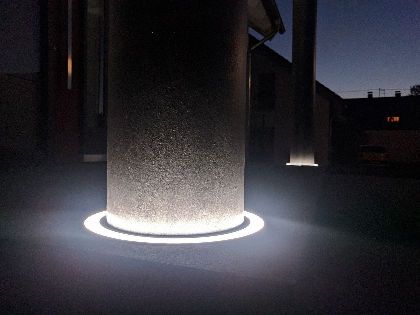 Nächtliche Außenbeleuchtung: Steinpfosten mit hellem Lichtkreis am Boden.