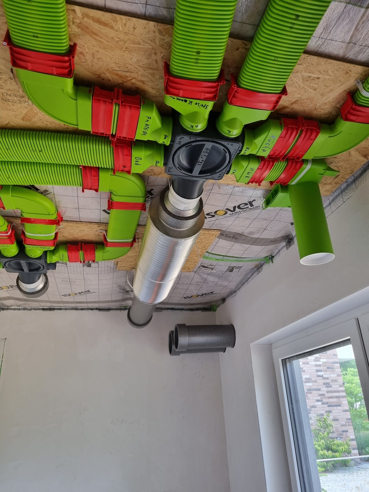 Neubau202227.07.22 09:40Bei uns werden die Rohre der Kontrollierte-Wohnraumlüftung unter der Decke verlegt. Nimmt in den Wohnräumen ca. 12 cm Höhe weg, dafür haben wir aber auch ein Stein mehr gesetzt, so das wir immer noch auf 2,69m kommen. Hier paar Bilder (die grünen Rohre, die aus der Decke kommen).