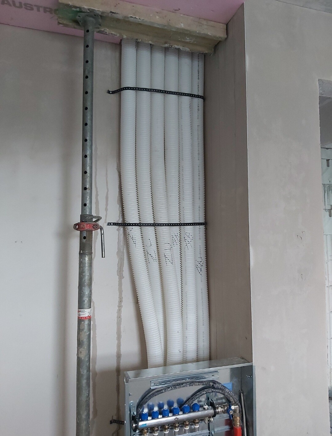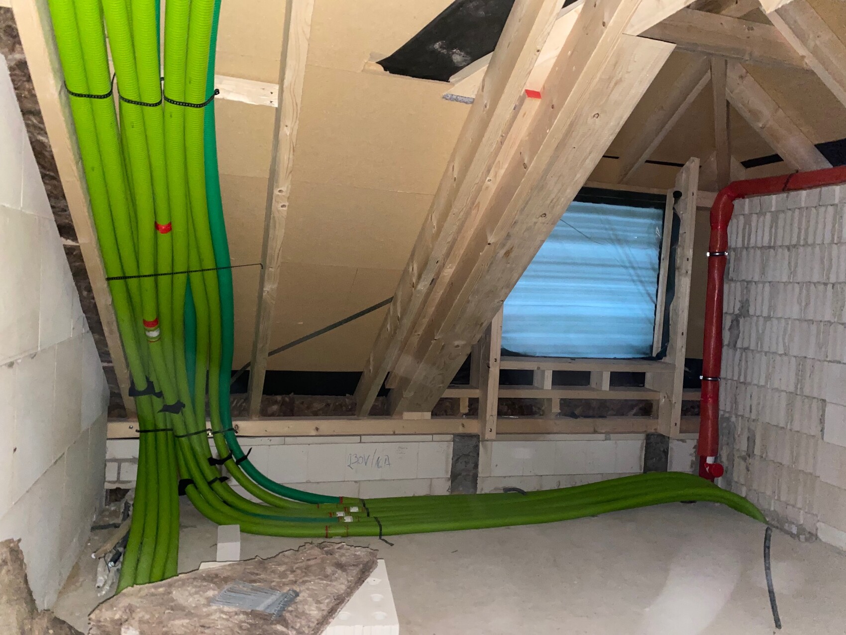 Dann sollen die Rohre für EG und Keller am Dach entlang nach unten gelegt werden, bevor es im EG dann an der Wand hinter einer kleinen Abmauerung in den Keller geht. Das Thema Dämmung habe ich beim Bauleiter angesprochen und er meinte, das wäre kein Problem. Die normale Dämmwolle soll dann hinter den Rohren gegen etwas "besseres" getauscht werden.