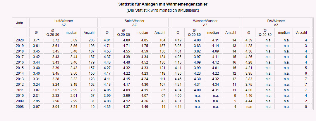 Ich habe letztens einen Artikel gelesen, dass der Großteil der Wärmepumpe keinen COP von 3 erreicht und unwirtschaftlich sind. Das war Balsam für meine gescholtene Heizungsseele, da meine Anlage ja zwischen 3,0 und 4,0 abliefert 😀Bei diesem Thema empfehle ich immer die Verbrauchsdatenbank für Wärmepumpen (kann man beim googeln leicht finden). Diese Echt-Werte von Nutzern (die sich eher - gemeinsam mit Ihrem Heizi - Gedanken über ihre Heizung machen), die realistische und gut erreichbare Werte aufweist. Auffällig ist die kontinuierliche Verbesserung über die letzten Jahre.Tolentino12.02.21 13:38