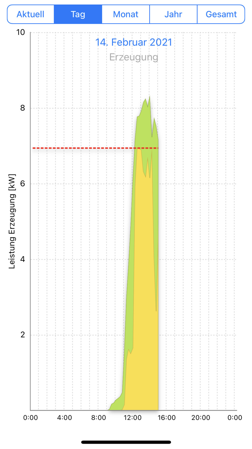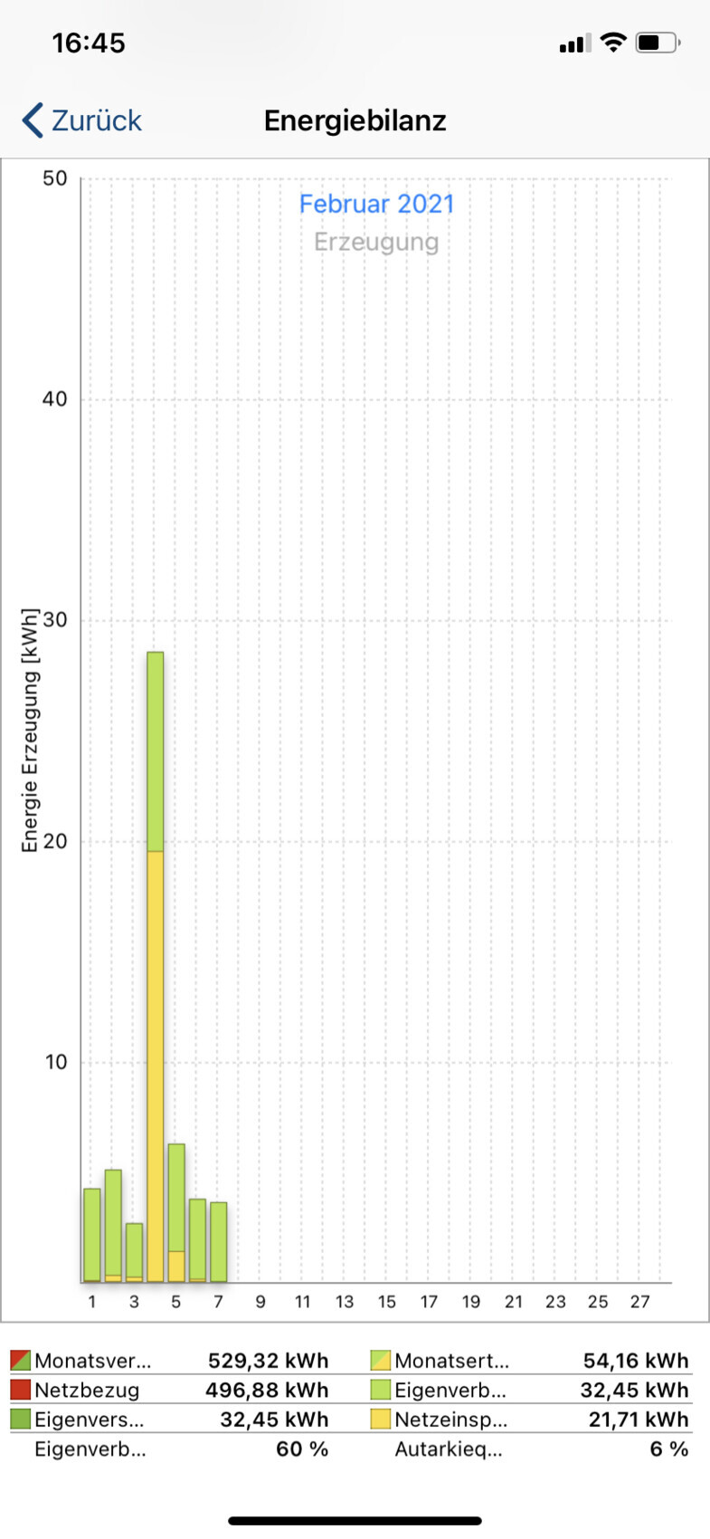 Um 13 Uhr war die Heizung tatsächlich mal aus, da war der Rücklauf bei 28,5 Grad. Fünf Stunden später (trotz Sonne) war dann der Rücklauf bei 25,5 und die Heizung ist wieder angegangen. Wird also morgen wohl etwas weniger als 45 kwh sein, schauen wir mal.