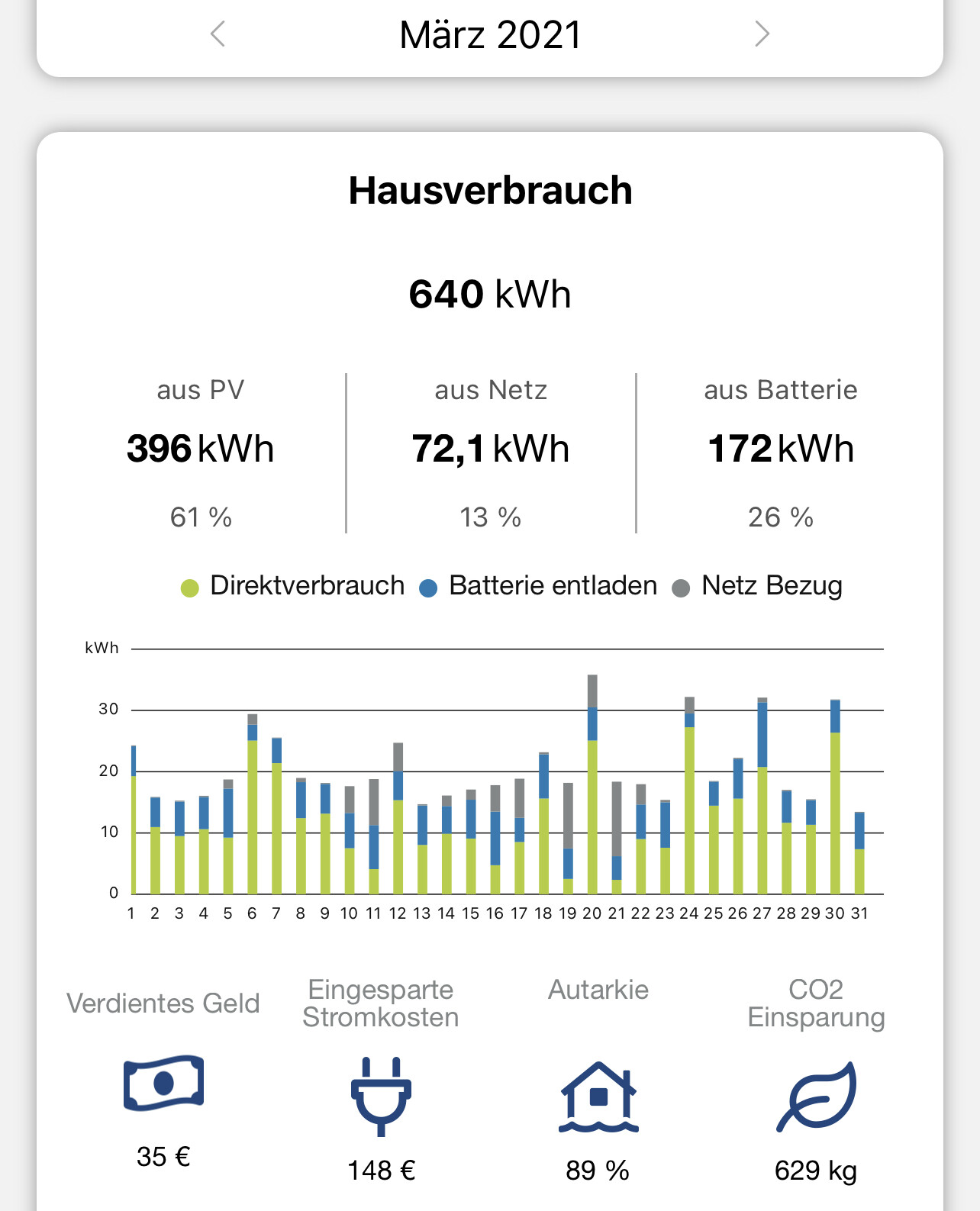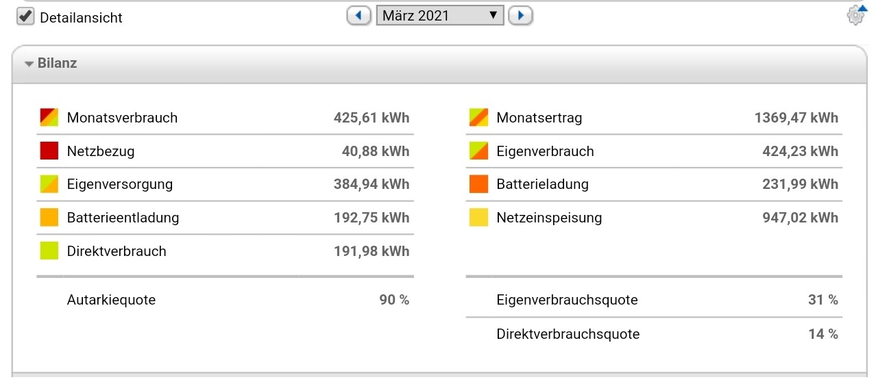 Der März war ganz angenehm. Die Spitzen im Verbrauch waren das E-Auto. Aber im Grunde haben wir wie auch schon Ende Februar nicht mehr auf den Verbrauch geachtet. Wobei der Keller Ende des Monats für 5 Tage beheizt wurde. Merkt man scheinbar in der Grafik nicht. Aber da sind auch die Temperaturen hochgegangen. In 2 Wochen werde ich die Heizung auch ausschalten.