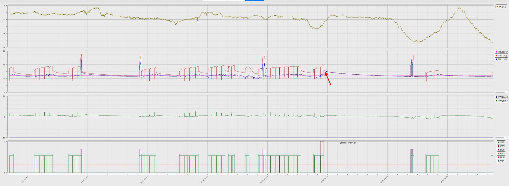 An dem markierten Punk, war da der Heizstab aktiv? Kann es leider in der Grafik nicht genau erkennen?Hatte in der AI/Novelan-Wärmepumpen nicht einen defekten Rücklauffühler vermutet?