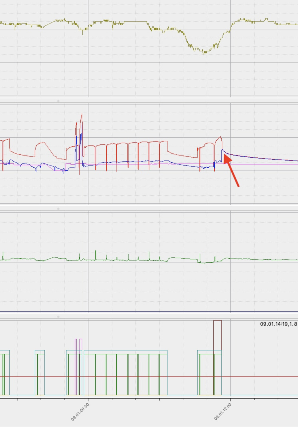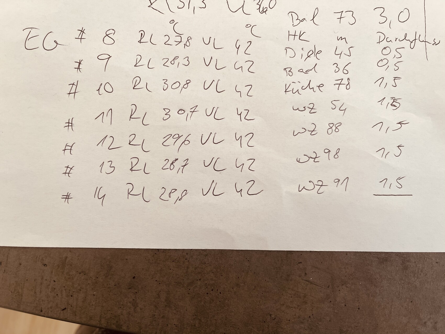 Hier schau mal das Handgeschriebene sind die gemessenen Rücklauftemperatur am HKV im EG vom 9.1. um 11 Uhr wo die Spreizung so richtig eskaliert ist. Im HKV sind die Rücklauftemperatur irgendwo bei 28-31 Grad. Der Fühler der Wärmepumpe zeigt irgendwas um 25 Grad an.