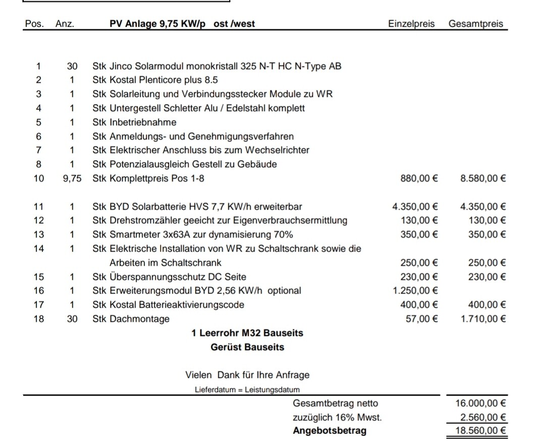 Kannst so bestellen (den Speicher und den WR hab ich selbst) wie es ist. Preis ist auch ok, günstiger wird’s nicht. Aber bedenke, da steht Gerüst „bauseits“. Das Gerüst wird Dich 1k€ zusätzlich kosten.