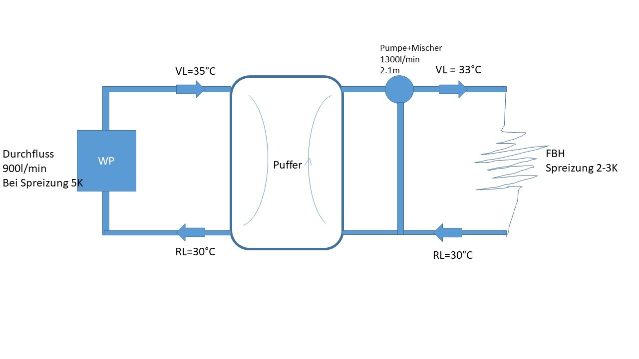 Optimal wäre es genau anders rum: Durchfluss der Wärmepumpe ein bisschen höher (100-200l/min) als die im Fußboden.