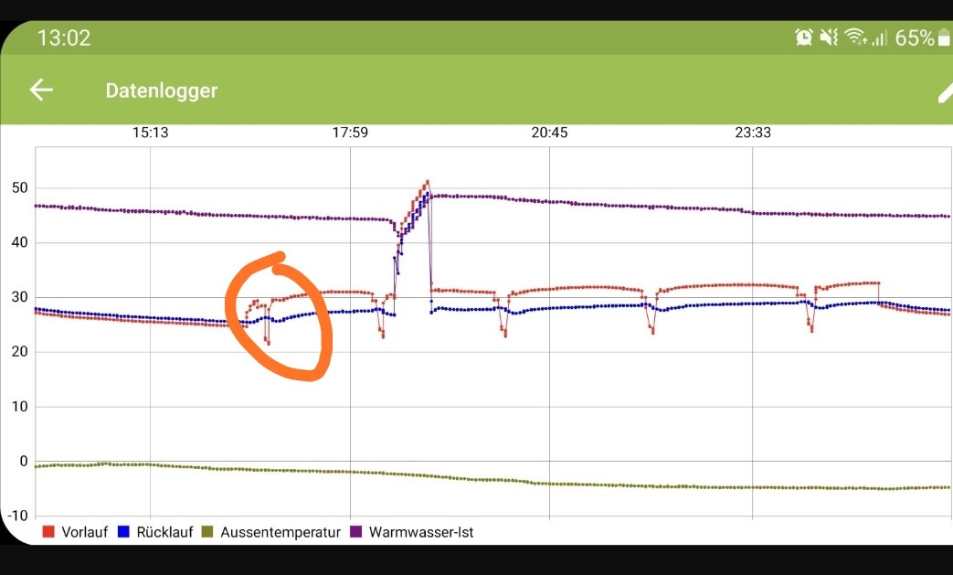 Was führt dazu, dass der Rücklauf so schnell sinkt?Ich würde sagen die -3 Grad Außentemperatur 🙂. Aber die hast du ja auch, somit wäre das keine Erklärung.