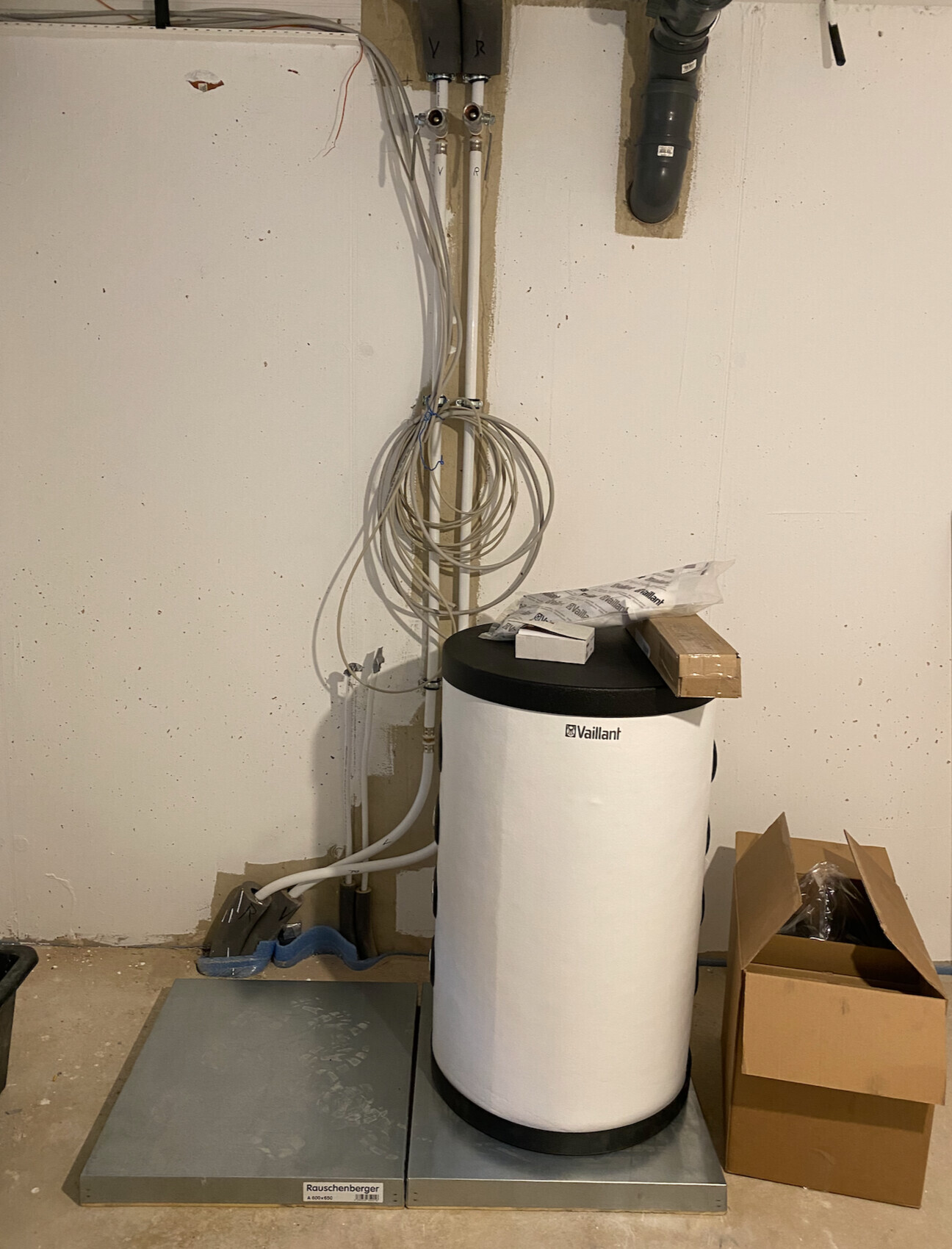 Vaillant-Warmwasserboiler im Keller; lose Kabelstränge an der Wand, Karton daneben.
