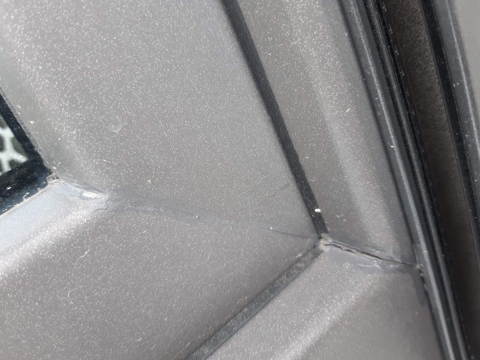 Als nächstes verbogen sich die Festglaselemente auf der Westseite april 2019 sowie die Schiebetür. Die Ecken der Elemente brachen und wurden von Gealan im Dez 2019 verklebt. Ebenso mehrere Fensterflügel. Durch Verklebung sehen dann die Ecken wie mit dem Lackierstift angemalt aus. Reparatur nach EU Gesetz.