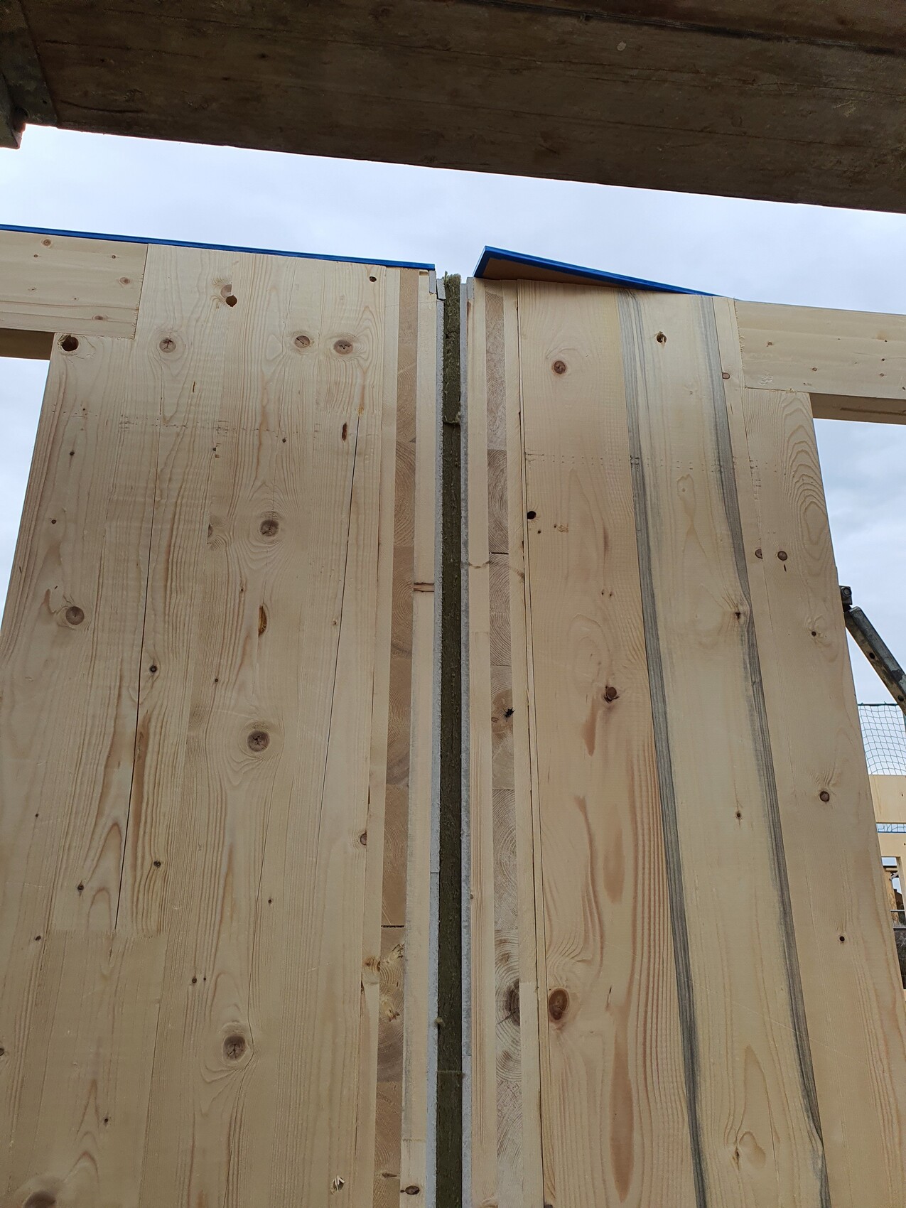 knalltüte29.10.20 19:17dazu mal als Beispielbild unserer Kommunwand. "Natürlich" getrennt durch spezielle Schallschutzdämmplatten. Genaue Bezeichnung habe ich aber gerade nicht zur Hand. Wir durften definitiv keine Steckdose in der Kommunwand planen. Dementsprechend auch keine Schlitze etc. für Kabel. Das war bzw. ist bei uns auch nicht nötig. Auch die Treppe vom OG zum DG wird nicht an der Kommunwand befestigt! Die Platten mit den blauen Kleberändern oben auf der Wand sind übrigens Schallentkopplungsplatten: Karton mit Sand gefüllt. Druckstabil und entkoppelnd. Ränder verklebt damit der Sand nicht herausrieselt