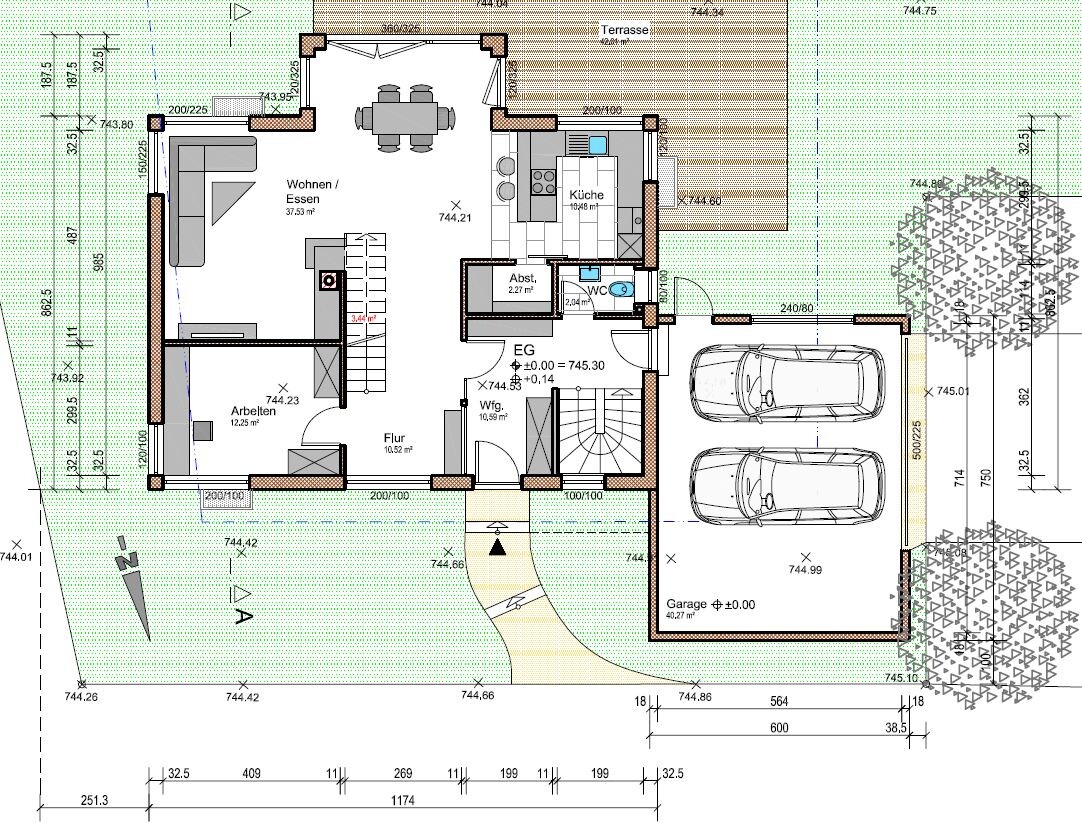 Ich kann leider auch die Tiefe der Garage nicht ablesen. Eventuell wäre ein Carport für ein Pkw mit Überdachung zum Haus für einen zweiten Stellplatz, Zufahrt von Norden aus, eine Alternative?