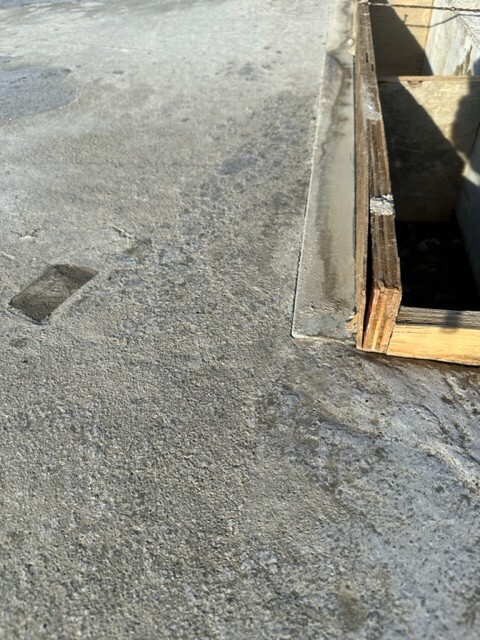 Die Winkelschienen als Kantenschutz hängen teilweise einige mm über der Bodenplatte, da auch hier nicht genug Beton darunter kam
