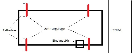 ich muss noch einmal kurz klar stellen, dass die Position der Dehnungsfuge in unserem konkreten Fall von GU/Maurer festgelegt wurde (mit der Option für uns, es links oder rechts der Tür zu machen). Der Gutachter hatte nur angemerkt, dass aus seiner Sicht bei unserer Wandlänge zwingend eine Dehnungsfuge notwendig sei. Ich habe zudem mal eine Skizze der aktuellen Situation beigefügt. Da sieht man dann auch, dass zwei der vier Fugen wirklich (fast) hinter Fallrohren versteckt sind.