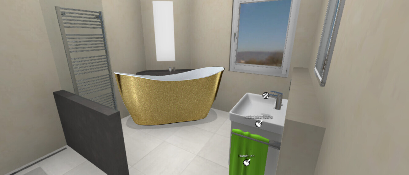Andererseits ist es ja auch "nur" ein Render und sieht in echter Materialauswahl doch viel besser aus.Ja nun, als "Farbe" habe ich einfach nur hellgrau ausgewählt bzw. bei der Trennwand so was wie Schiefer. Wird aber auch matt hellgrau werden. Ob noch ein oder zwei "fancy" Details (z.B. das Einbauregal über der Wanne oder der beleuchtete Spiegel) dazu kommen wird ja recht spät erst entschieden werden müssen. Da steht dann die Wanne bereits und es bleibt dann Zeit den Gesamteindruck nochmals neu zu bewerten.B