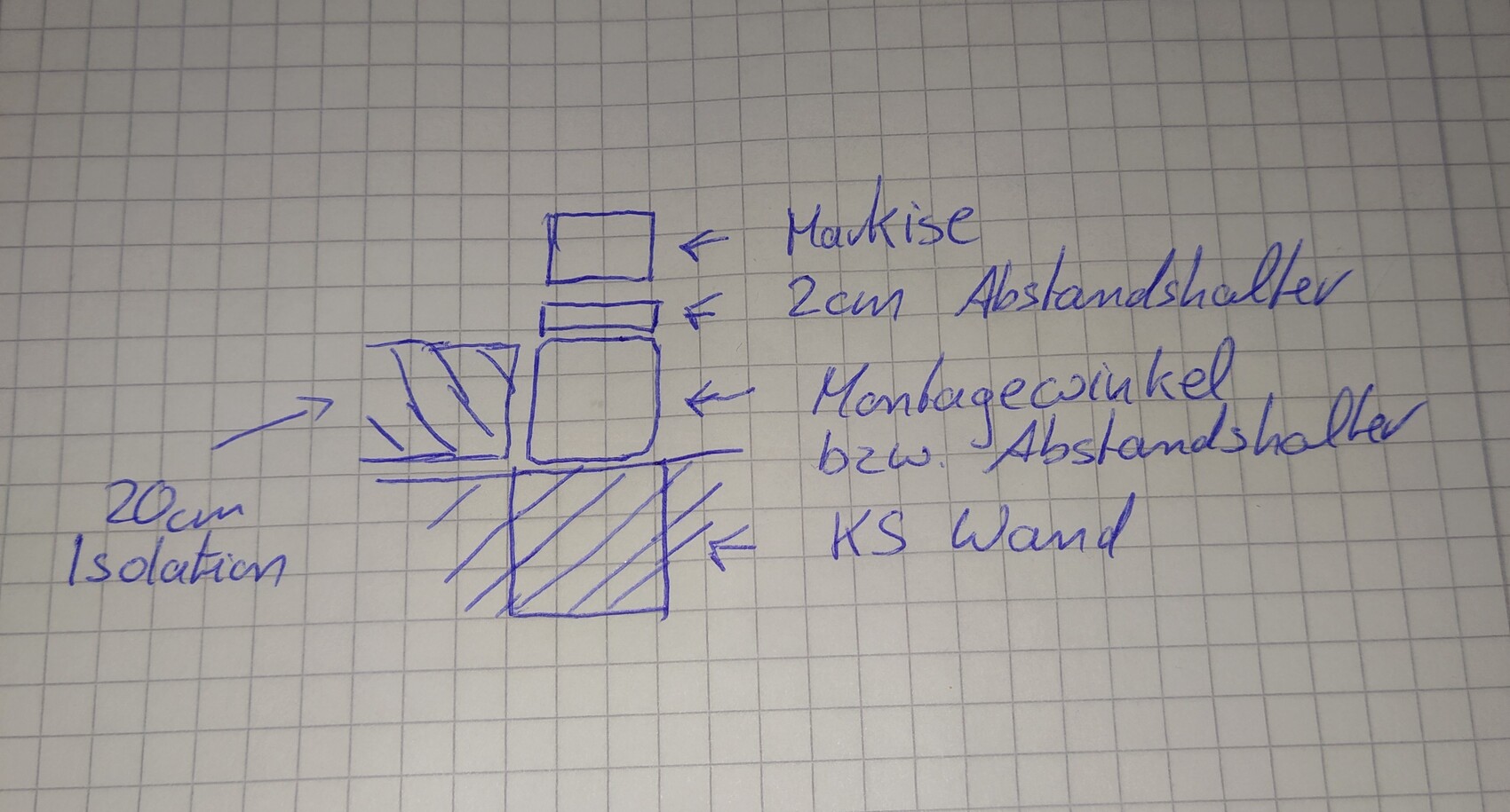 wir bauen im Moment ein Einfamilienhaus. Der Rohbau steht und in der kommenden Woche wird die 20cm Außenisolation aufgebracht. Darauf kommen dann ca. 2cm Außenputz. Wir haben bereits eine Markise bestellt und haben in der jetzigen Phase bereits 5 Montagewinkel für die Markise installieren lassen. Jetzt hat der Monteur die Markisenwinkel direkt auf die rohe Fassade geschraubt darauf kommen dann noch 2cm Abstandshalter und darauf wird die Markise montiert. Die 2cm Abstandshalter fungieren auch als Wärmeabkapslung zwischen Markise und Halter. Ich Stelle mir die Frage ob diese Abstandshalter nicht besser zwischen dem Winkel und der Wand platziert werden, oder ob es thermisch vernachlässigbar ist wenn der Abstandshalter zwischen Markise und Winkel positioniert ist?