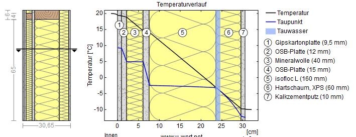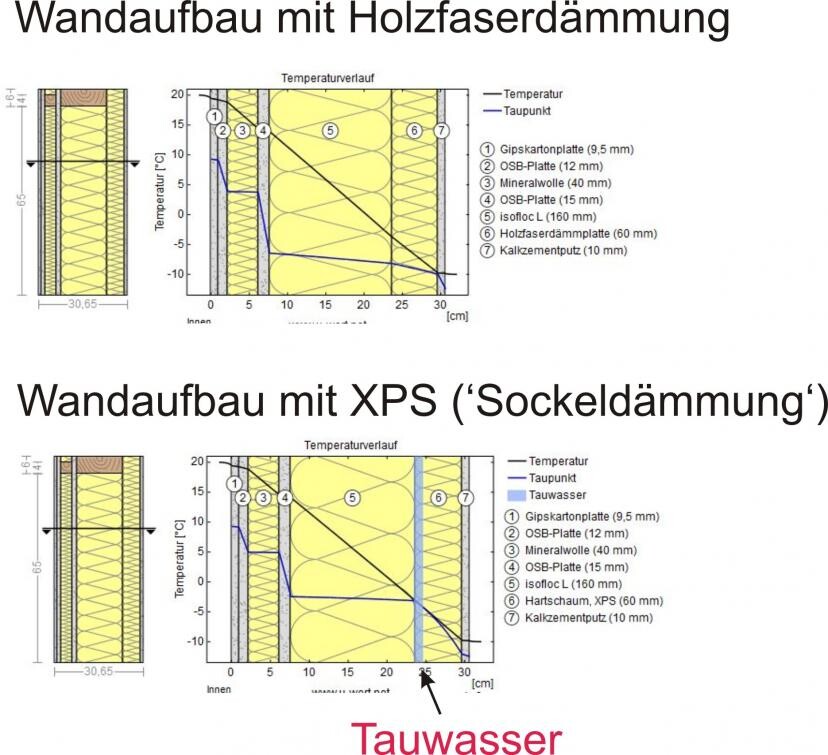 Dann is ja jetzt alles klar!Ich hoffe mal, daß das auch so ist. Bei der Berechnung der Wand (ist eine Homepage, mit der man den U-Wert und die Feuchtigkeit berechnen kann - der Link darf aber hier ohne Bestrafung nicht genannt werden :cool , rutscht jetzt allerdings der Taupunkt in den Wandmittelpunkt. Es bildet sich also Tauwasser zwischen Holzständer und der Dämmung (siehe Bilder im Vergleich). Ich denke das liegt an dem wasserundurchlässigen XPS-Dämmung.