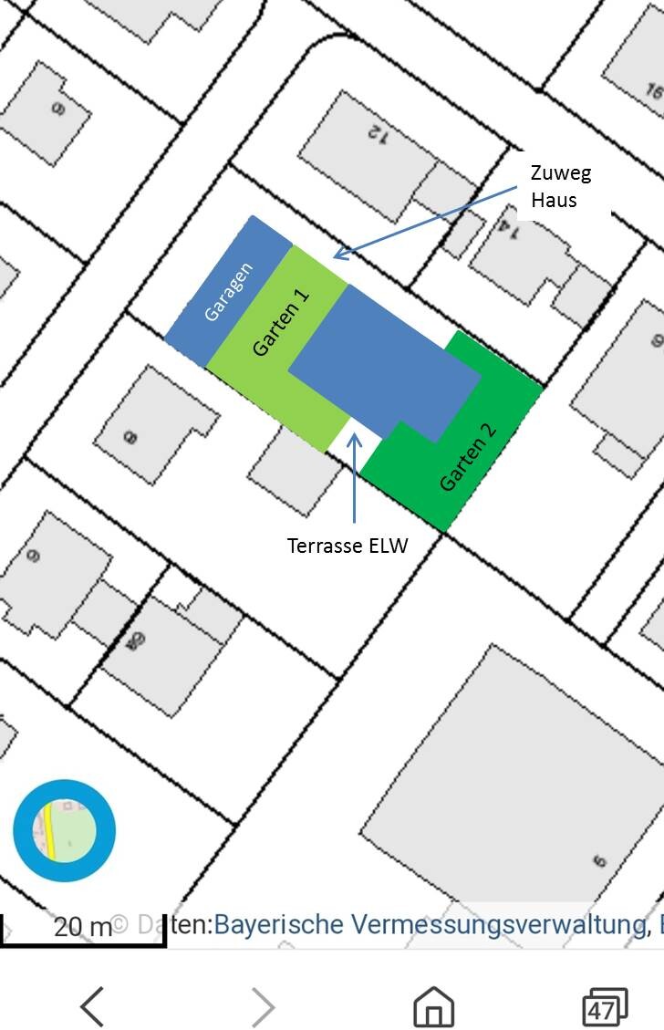 So sehr ich mir als Rentner in ferner Zukunft ein schönes Penthouse mit Dachterrasse (ohne Garten den ich Pflegen muss) wünschen würde, glaube ich, dass hier das dafür notwendige 3. Treppenhaus (Fluchtweg!) + Aufzug etwas zu viel ist (Platzbedarf, Kosten). Vielleicht kann ein guter Architekt mit einem Haus mit etwas L-Form (s.Skizze) einen Plan entwerfen, der die beiden Wohneinheiten etwas besser als bei einem klassischen Doppelhaushälfte trennt (zur Konfliktvermeidung) und individuelle Wünsche im Grundriss besser berücksichtigt als ein Spiegelentwurf. Bei 14m Breite des Baufensters und vermutlich um die 200m2 Grundflächenbedarf des Hauses (ich geh von 2,5 Etagen aus) ergibt sich ja ein quasi quadratischer Baukörper. Bisle in die Länge gestreckt sollte sich da doch einige kreative Gestaltungsmöglichkeiten ergeben.
