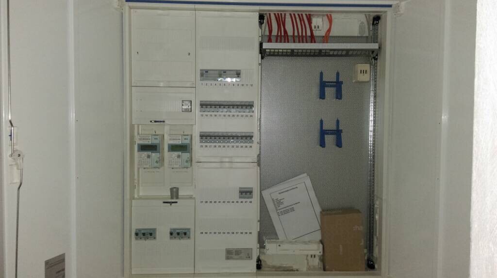 Hat jemand Erfahrungswerte für einen 19Zoll Netzwerkschrank (9HE) mit Montage und Erdungssatz, Befestigungssatz, Steckdosenleiste, Patchfeld? Mein Elektriker hat 528 Euro (netto) aufgerufen......Hinzu kommen noch 180 Euro für Datenkabel einführen, beschriften, anschließen und 170 Euro fürs Messen der symmetrischen CU-Verkabelung gemäß CAT6....Den Aufwand hab ich mir gespart. Unser Elektriker verbaut im Standard einen extra breiten Sicherungsschrank. Die Sicherungen und Zähler belegen darin nur die linke Hälfte. Rechts oben ist ein Patchfeld mit 24 Ports auf dem unsere Dosen aufgelegt sind. Rechts unten eine Steckdosenleiste. Dazwischen ist ein Befestigungssystem in welchem man aus meiner Sicht ausreichend Netzwerktechnik unterbringen kann. Entsprechende Aufhängungen sind auch dabei. Das NAS kommt wie bei tox nebendran.